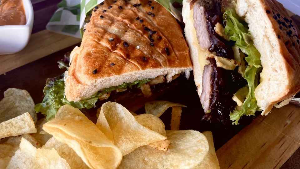 Jamón Pechuga de Pavo (50gr), Piña Asada, Queso Manchego, Lechuga y Pimienta.