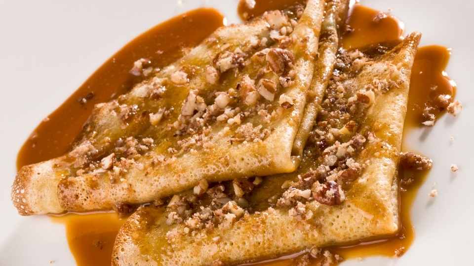 Crepas Artesanales bañadas con una deliciosa cajeta elaborada al momento por nuestro cocinero, flameada con Brandy y Licor de Café, con un toque de vainilla y canela.